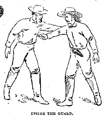 As in boxing the feet play a big part in scientific knife sparring. The nimble side slips of the bull fighter are brought into play and no one in the world is quite so good as the Mexican at this part of the game. The old Spanish gentleman used to stand nearly erect in the knife duel and handle his instrument something after the manner of a sword, but the Spanish-American squats beyond dignity, whirls his blade in a circle from his nimble wrist to dazzle his adversary, and attempts in all manner of ways to alarm and unnerve his opponent for a safe opening. Mexicans fighting among themselves usually throw off the sombrero and sometimes mutually agree to the serape, but when a greaser gets into close-quarter fighting with white bordermen the sombrero is just what he wants. Circling about his adversary and getting him into a stiff, waiting guard, he will suddenly lash his big hat into the man’s face and have him disemboweled before he is aware of the stratagem. Then the foul kick for the stomach is a trick that makes the new world knife fighter altogether ahead of his Andalusian prototype for practical results. All fighting Mexicans or vaqueros wear boots with high tops and heels and heavy thick soles, with which one is liable to receive a ripping side kick under the guard at an unexpected moment. The way is paved for the foot blow by a series of continuous hoisting of the right knee during sparring.