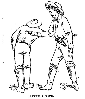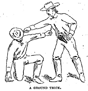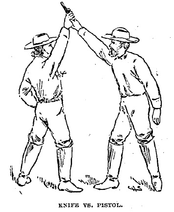 Another trick is when an adversary’s knife thrust is engaged to pin his right foot to the ground, disengage and stick him when he is catching his balance. The throwing of a knife, affected in practice by would-be bad youths of the North who have sought education in the dime novel, is useful only as a circus trick. The true knife fighter would no more think of risking his life by such a thing than the cowboy would take chances of braining an adversary by throwing his gun at him. A knife thrown at one is easily dodged as a club or other missile, and the party at whom it has been thrown may in most instances kill his enemy at leisure, having his man disarmed.