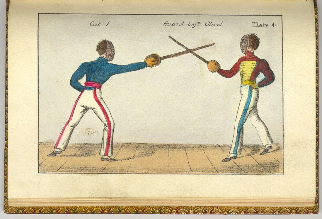 This small booklet was published by Capt. Frederick Wroughton in 1830. With perhaps a few variations, it follows the method of Angelo which was largely taught in the British military of the time. The size probably explain the colored plates, which are rarely seen in martial arts manual of the 19th century.