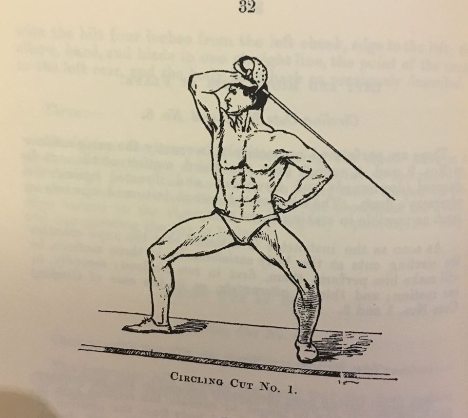 2. Circling cuts, which are a series of exercises in “cutting” that tend to develop in the highest degree power over the weapon ; and enormous force can be put into these cuts, since the hinge-joint of the elbow is the centre of a circle of which the distance from the elbow to the point of the sword is the radius, for in this system the wrist-joint is never allowed to move except in the action of adduction-at the finish of the delivery of a cut. The wrist, being a universal joint, is capable of any form of error in making a cut; whereas the elbow-joint, having one motion only, cannot possibly deflect the edge from its objective. Consequently a cut made in accordance with Masiello’s system cannot be delivered otherwise than with the edge leading.