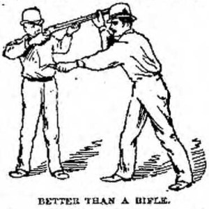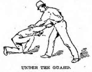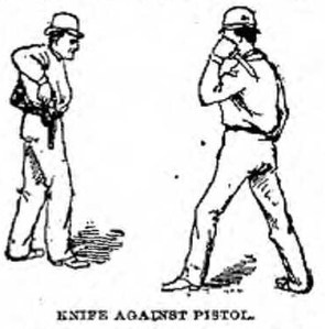 “I don’t know about that,” said Mr. Ohnimus. “More men carry knives than you think, and I know of those who, at a distance inside of twenty feet, could best any man, except an expert, with a pistol, and even the expert would find it hard work to get away with them. As to the question of skill, there is a great difference between men in handling knives as there is in fencing. You can judge how skillful men may become when you know that some of the celebrated knife duels lasted for hours – and the men trying to cut each other all the time – before one went under. I’m not an expert, but if you like, I’ll show you a little of the science of the knife.