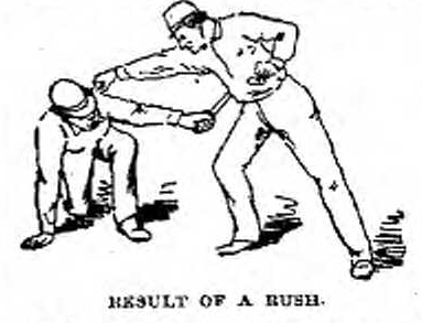 The two took their positions with wooden knives and Ohnimus’ knife point began to dance before the reporter’s eyes. A few seconds of this during which Ohnimus constantly shifted his position, then the man who understood knives dashed his hat into his opponent’s face and at the same instant brought his knife against his breast.