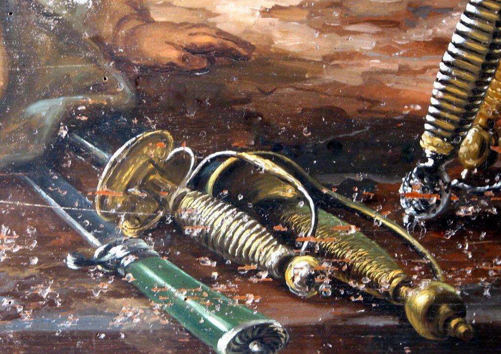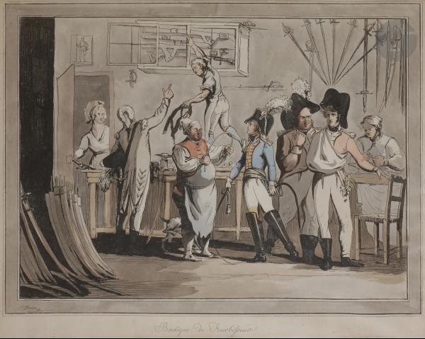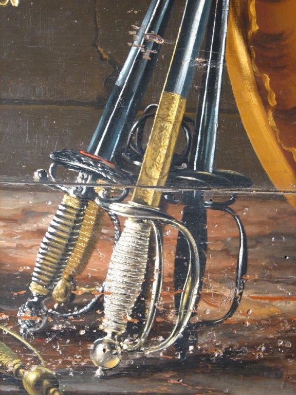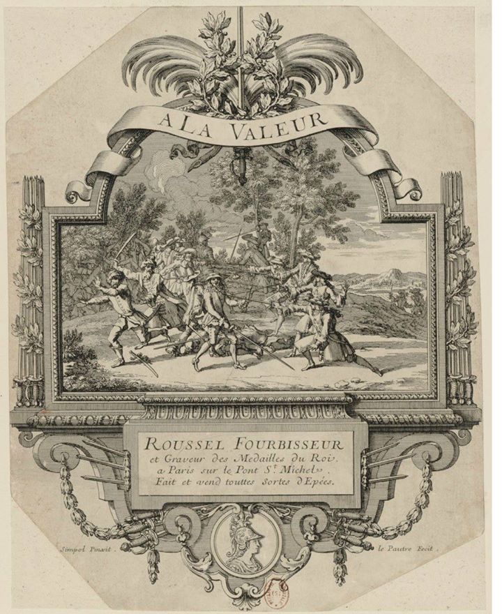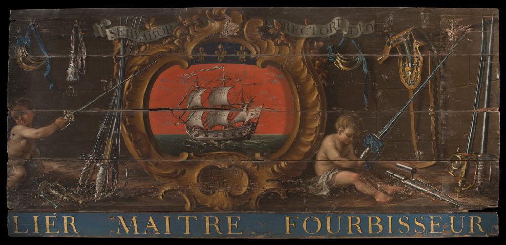 This following wooden sign was made for a French furbisher in the 1760s. It shows its different products in incredible details, including smallswords, sabres with folding guards, bayonets as well as hunting swords and sword knots. Click here for a detailed analysis of the piece by Michel Pétard.