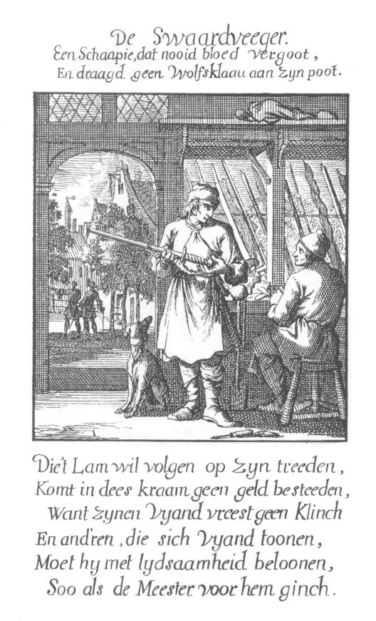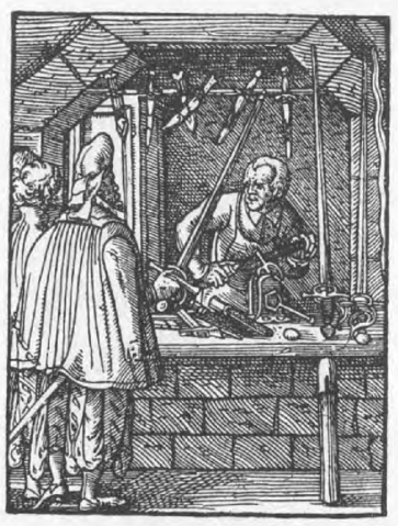 This furbisher is fetching sword belts for a client in a glass case. Note also the older swords decorating the walls, and the pile of blank blades waiting to be fitted.