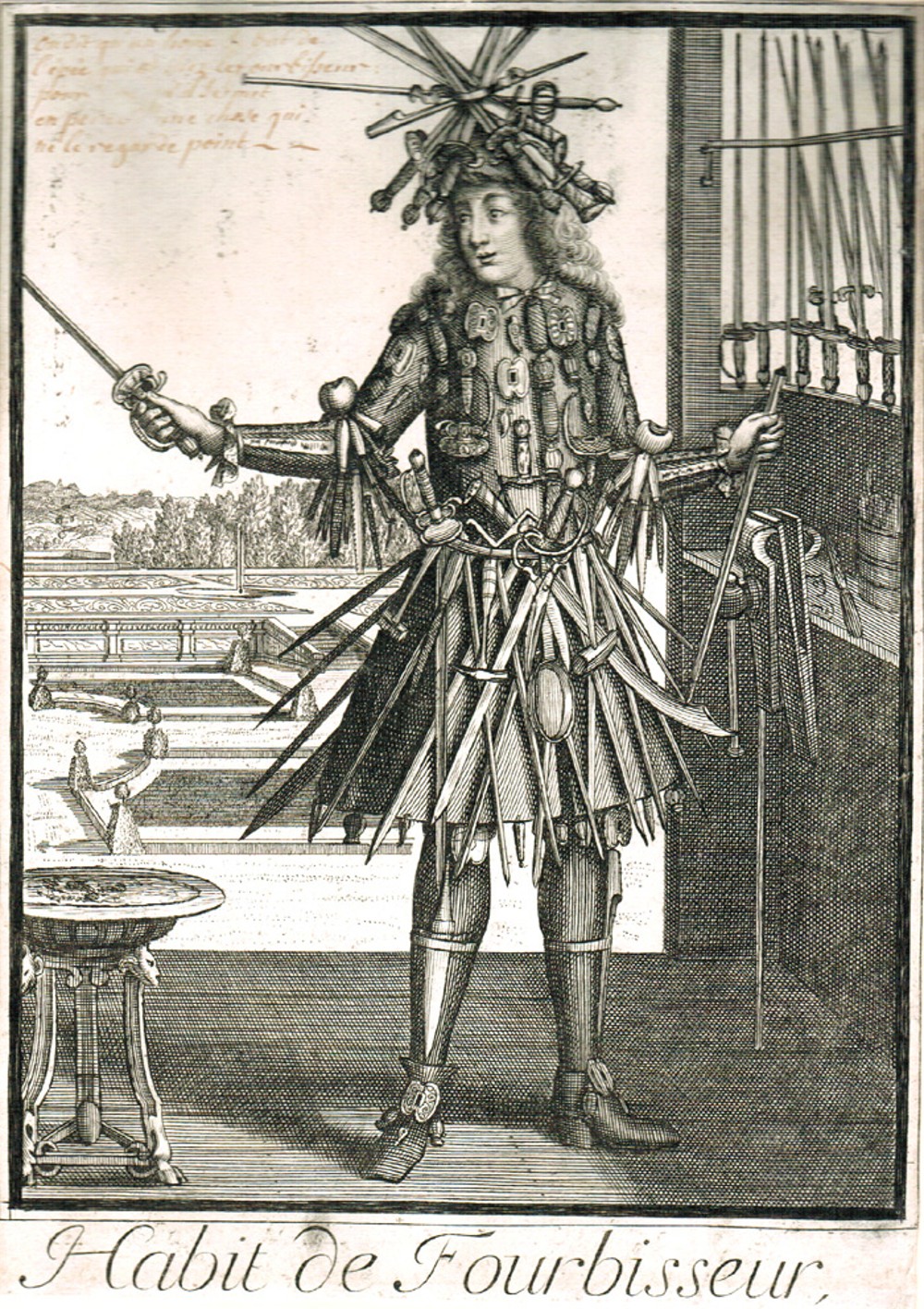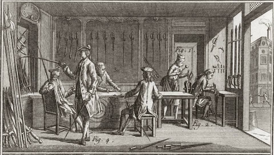The classical illustration of the furbisher’s shop in Diderot’s encyclopedia. As in the previous illustration, a client is testing the flexibility of the blade as a test of quality.