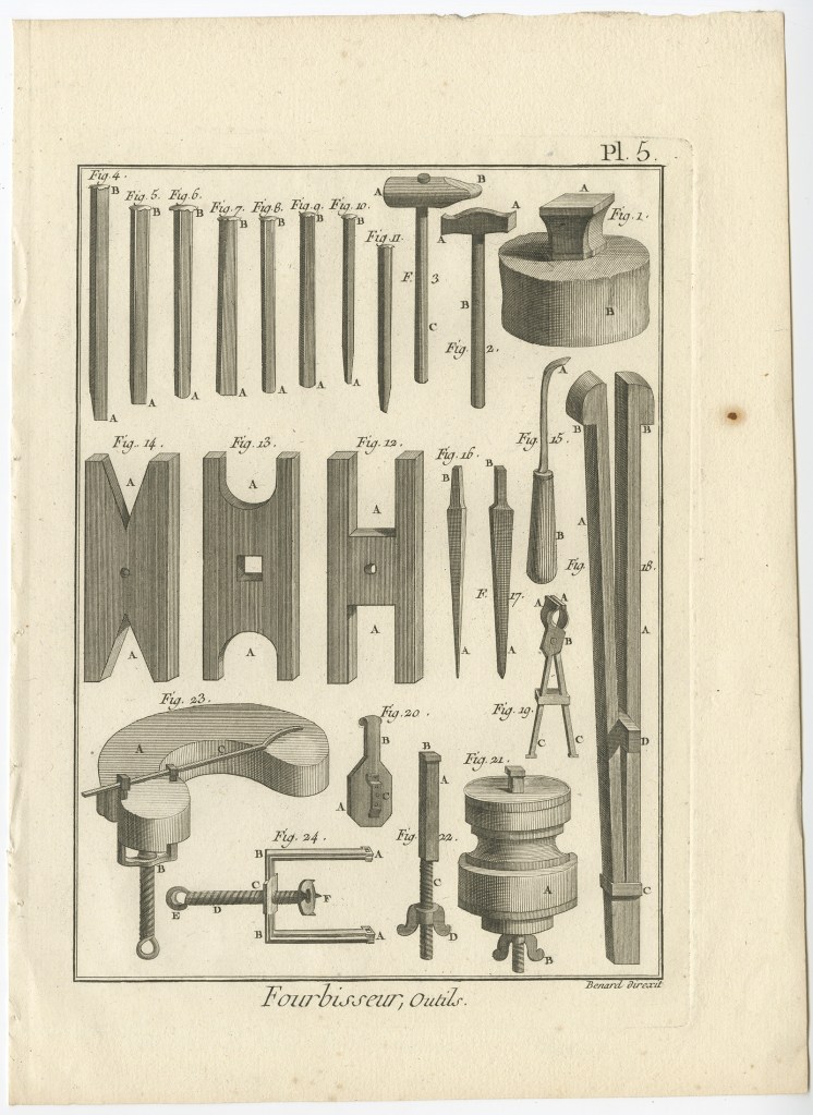Tools of the furbisher by Diderot. Note the clamp, illustrated in nearly every representation of a shop.
