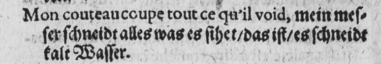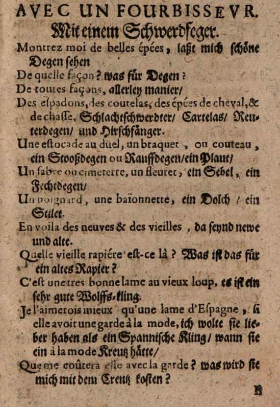 Much like a modern day travel guide, Martin’s book gives a few example of conversations that could happen with various people in German speaking towns. The most interesting for us, of course, is the one with the fourbisseur, which could be translated as furbisher or sword cutler.