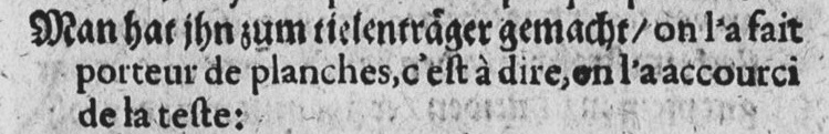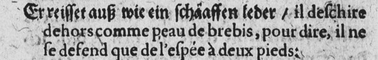 “It is ripping outside like sheep’s skin”, to say “he only defends with the two feet sword.” The meaning of two feet sword is quite unclear here. It could refer to the length, but may also be a play on words on an épée à deux mains, or two handed sword.