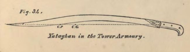 For line infantry officer’s sword, the yataghan-shaped blade should have the same thickness as those of the present sword, but curved in the opposite direction; the point should be at one -third of the width from the back, and be bisected by the line of impulse.