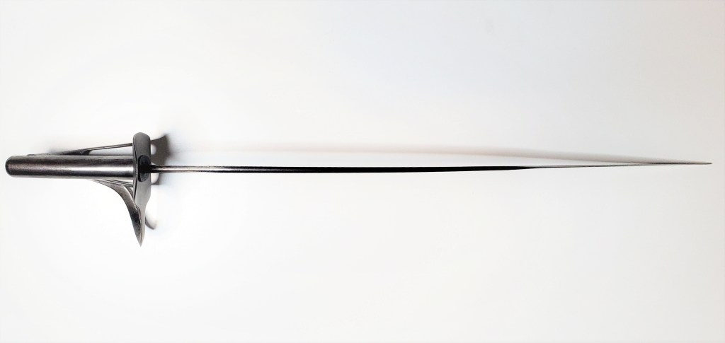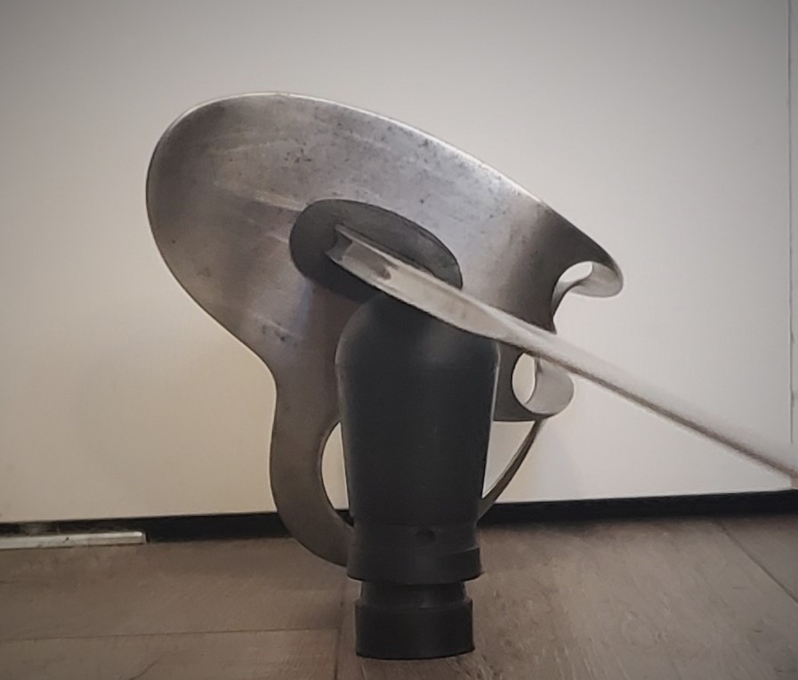 First, it puts the centre of percussion and of gravity below the axis of the grip. This corrects a common issue with heavily curved sabres, in which the centre of gravity tends to be well above the grip’s axis, which can make the sabre turn in the hand during a cut, The Marey sabre is -in that sense- rather more or less built like an axe, making the cut a lot more stable.