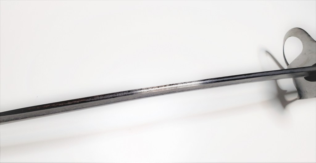 When I received this sabre through the mail, the first detail I saw that confirmed to me that this was a Marey sabre was the fluted back. I couldn’t quite grasp the meaning when reading the text, but this is actually quite smart. The fuller runs the same lenght as those on the flats, and allows that portion of the blade to be stiffer and more resistant by widening it, but removes the extra weight created by fullering it. I do not know if this is the case here, but Marey is basically trying to create a differential temper on the blade, making the back softer through the heat created by the grinding of the metal. One would think that this have been inspired by Japanese swords, but blades made in Klingenthal already had such differential temper, as the edge was usually hammered into a softer back. This is unlikely to be the case of this sabre though, as it was probably made of crucible steel, which had become the norm in France at that time.