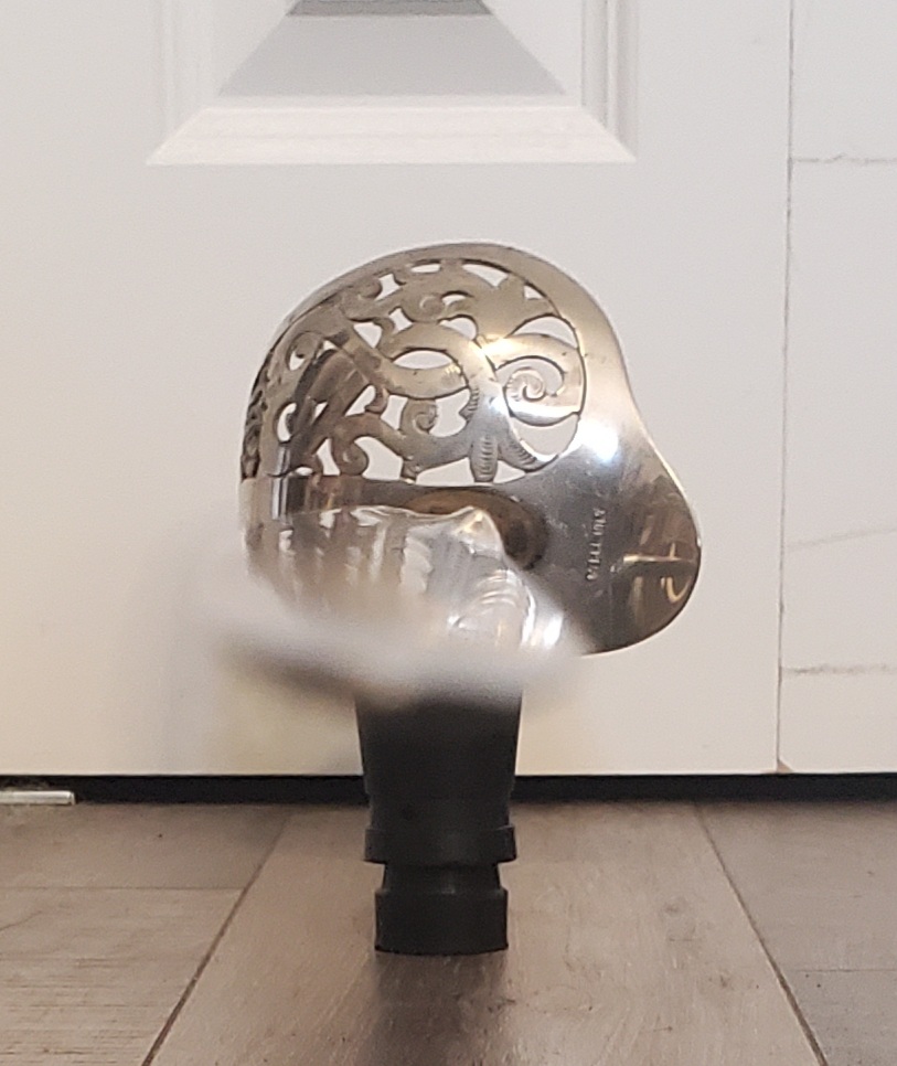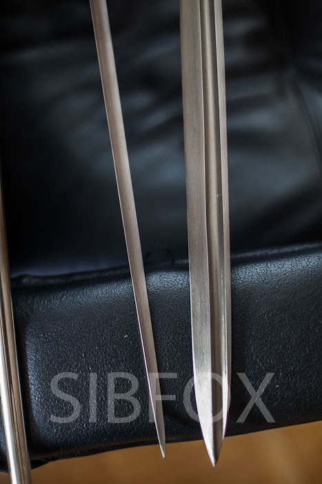 I observed that the sabre, when standing only on it’s point of balance, did not fall flat to it’s side like most asymmetrical hilts tend to do. Instead, it remained balanced on its edge, but at an exact 45 degree angle. I imagined that this was somewhat of a compromise, that if the sabre couldn’t be balanced straight in the middle the balance would remain somewhat centered. So I expected the sabre to fall flat as well when placed on the opposite side of the blade, but I was quite surprised with the result.