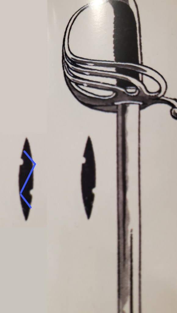 This is one of the only two points (with the grip’s width) where this sabre does not exactly follow the book’s recommandation. Both for the cavalry and infantry officer, the text tells us the back fuller must stop six inches from the point. On this blade, that fuller ends around 30cm (a foot) from the point. Maxwell has an interesting note about this in his translation that I believe gives us a possible answer.