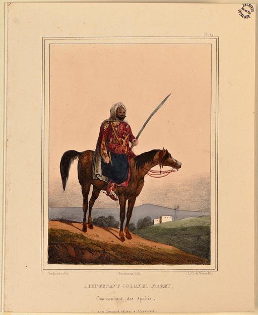 Marey was deeply interested by the culture he found there, he became fluent in the local languages, and pushed the French military to adopt many of the customs of the Algerian people. Among them, he is most famous for creating the Spahis, a light cavalry corps based on the tactics of local cavalrymen previously attached to the Ottoman Empire, and which counted many of them among its ranks. After the peace was declared in 1839, Marey went back to Strasbourg where he was given the command of the 1st cuirassiers, and went back to work on his sword designs and the writing of his memoir.