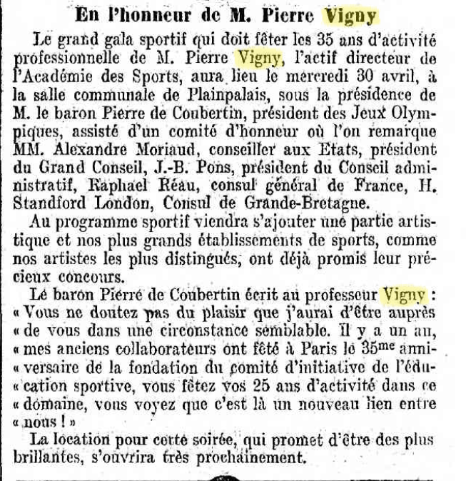 Still, probably the most surprising part of this article is its author: Pierre de Coubertin, the famous founder of the modern Olympic Games. It is unclear how Coubertin came in contact with Vigny, but , as we will discuss later, Coubertin was a student of Vigny. As far as we know, Vigny was not involved in the Olympic Games, but he seems to have maintained a certain friendship with Coubertin, as can be guessed from this announcement of a sports gala in honor of Vigny’s 35th anniversary of professional activities, and chaired by Coubertin himself.