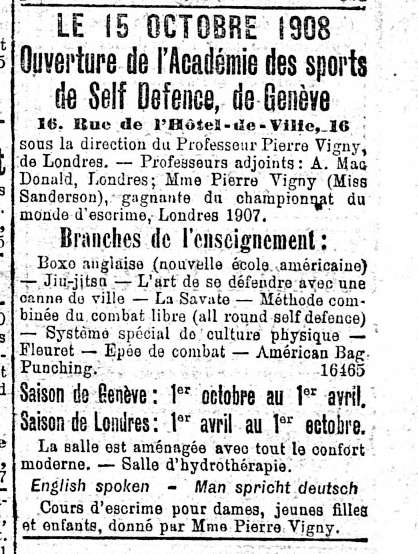 After 10 years in London, Vigny and his wife Marguerite Sanderson moved to Geneva to open up the the “Académie des Sports de Self Défense” on the 15th of October 1908. There, the Vignys, and their assistant Mr. A. Macdonald from London, basically continued the idea of Bartitsu by mixing martial arts of different origins under one roof. There they taught English boxing (according to the new American school), jiu-jitsu, La canne, savate, a “combined method of free combat” (all round self defense), a special system of body building, foil, epee and American bag punching. Miss Sanderson, world fencing champion of 1907, also taught fencing classes for women, young girls and children.