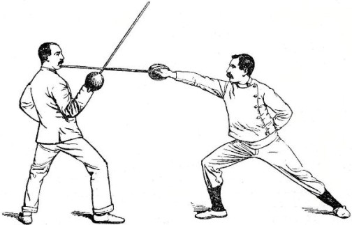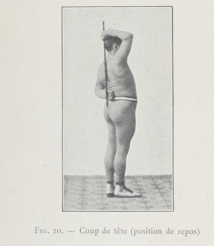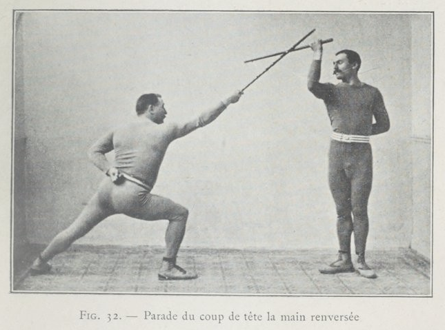 Charles Charlemont, in his father’s manual on boxing and La canne, showing here the development of a head strike. The preparation seem very similar to what is described in Angelo and Moore.