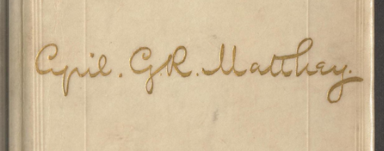 Cyril G.R. Matthey is noted as an ex libris on this copy, and even had his signed name printed on the front cover. It seems he had this done to several of the books in his collection, as others with similar covers can be found. The name may sound familiar to some, as Matthey is the person who found the manuscript of Paradoxes of Defense by George Silver at the British museum, and had it reprinted in 1891. Cyril G.R. Matthey was born in 1864, and was Colonel of the London Rifle Brigade, a member of the London Fencing Club, and honorific member of the Cercle d’Escrime de Bruxelles.