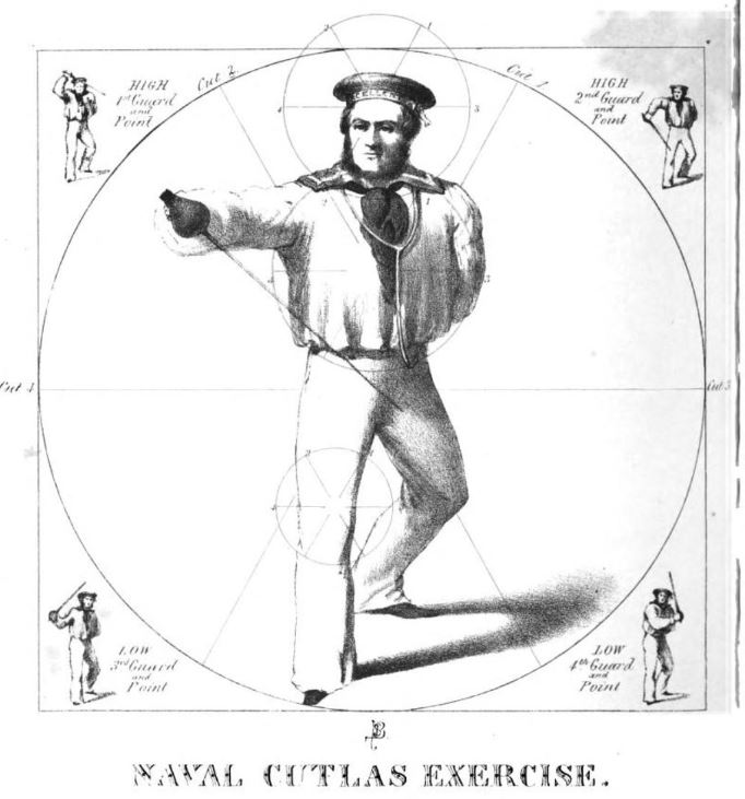 Another point in common for all the sources linked to Bushman is the inclusion of cutting feats as mandatory exercises for students, and the insistence on making “effective cuts”. Once again, Tuohy goes to an extreme, teaching larger cuts than is usually seen in sabre fencing, possibly as a way to quickly teach recruits, especially sailors, before introducing smaller motions.